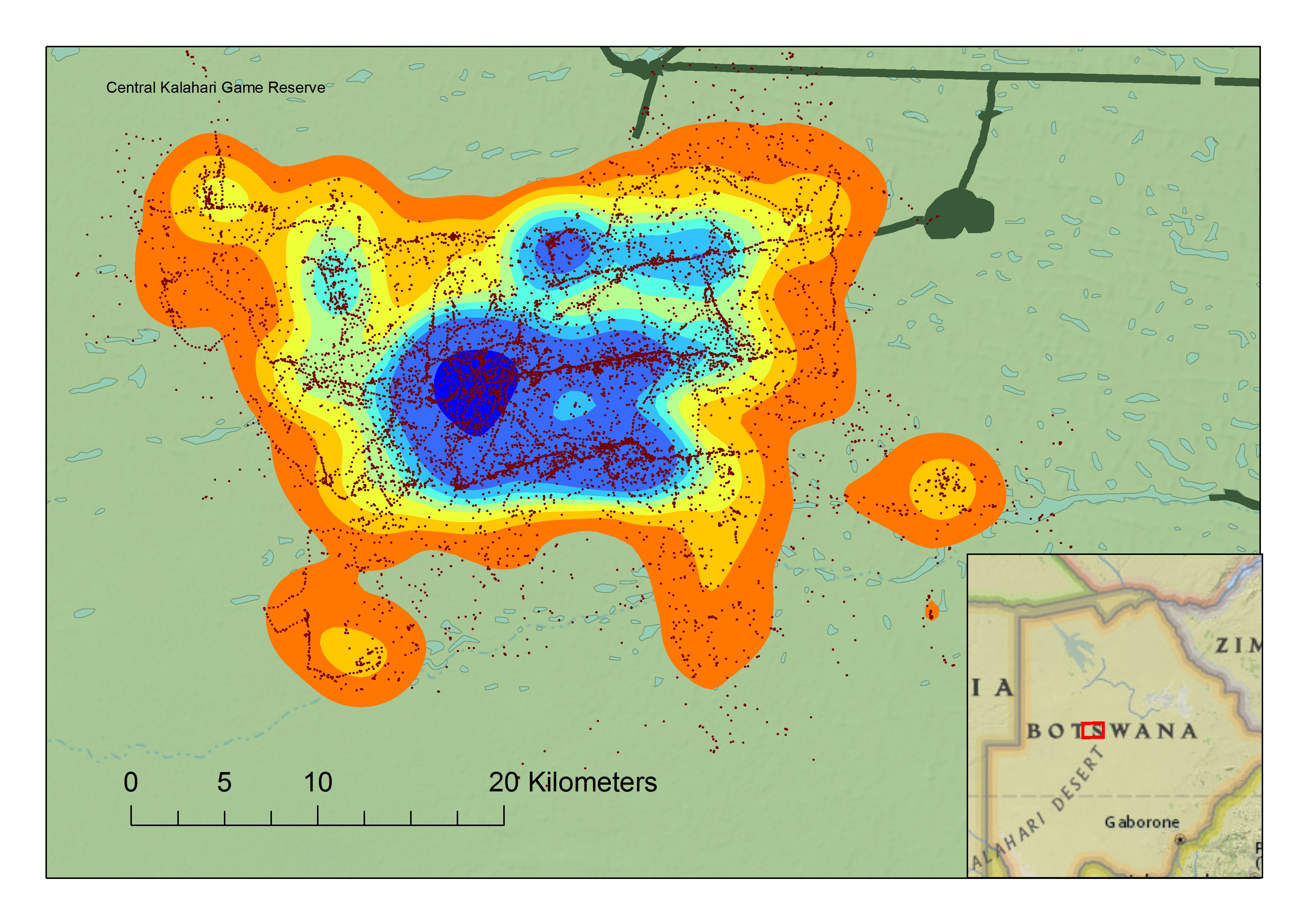 Lion SM009 was the first lion to be collared by the study proper, July 2009. He has an unmistakable scar across his mid-back, and was known from a November 2008 visit where he was found on Tau Pan. Initially SM009 wore a store-on-board collar, which was removed in April 2010 after nine months. This meant that the initial data was on the default schedule of one GPS reading every hour, every day. The collar was replaced with a GPS- satellite transmitting collar, where the data is collected by email daily, and the schedule can be changed remotely. The schedule collected has been as intended, half hourly at night, a midday fix, and a higher intensity fix rate of every 5 minutes at night for one week, every month.