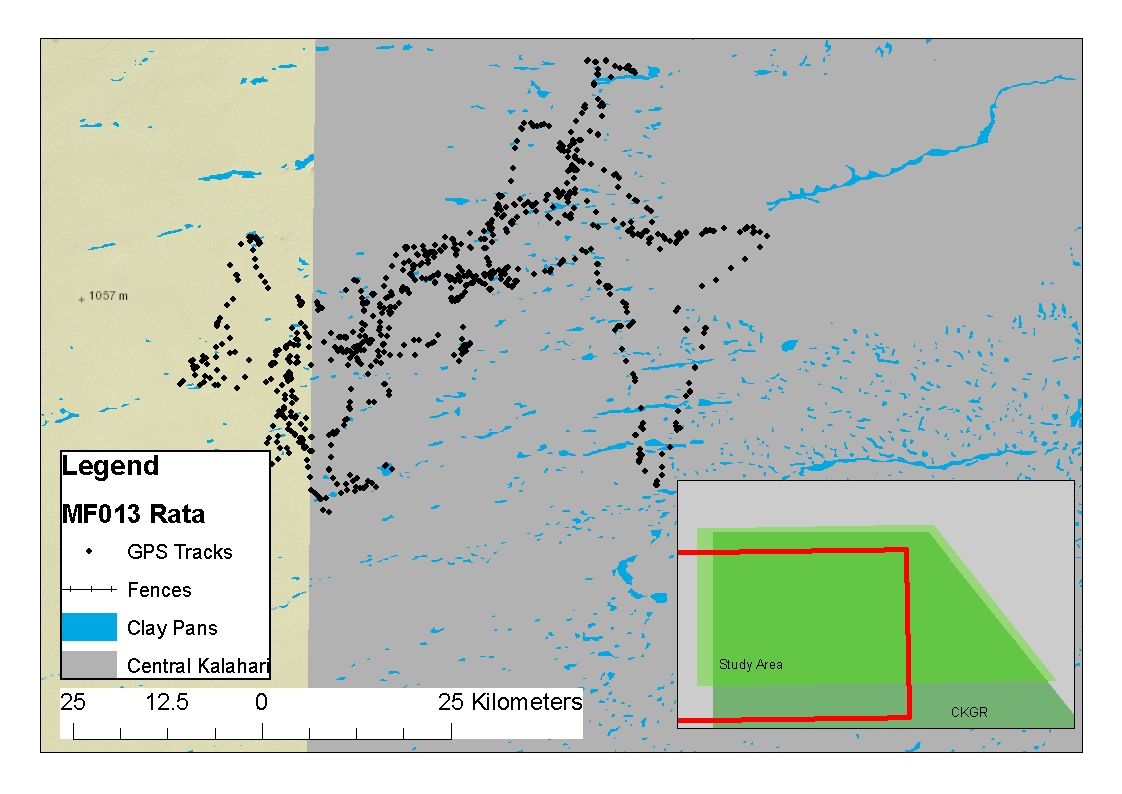 Lioness JF013 was collared near the centre of the Junction prides territory, but had soon departed from this area. She was a very young lioness and part of a family unit of five including an older adult female and a sister and two brothers of similar age. In contrast to the resident females, lioness JF013 and her cohort appeared to be a part of a roaming family unit with typical nomadic behaviour with no clear boundary (Figure 3.6), antagonistic behaviour to all strange lioness and movement patterns that did not on average return to a central place. The distinction of home range on a long term scale had less meaning from this lioness and was by far the largest calculated total minimum convex polygon for a female at 3,085.1 square kilometres. This very large range was utilized by moving on average 8.0 ±2.2 s.e. km per day similar to the mean daily movements for all CKGR lioness. After three months the collar was removed for use in residential females, and total MCP calculated included occasional sightings over the rest of the study.